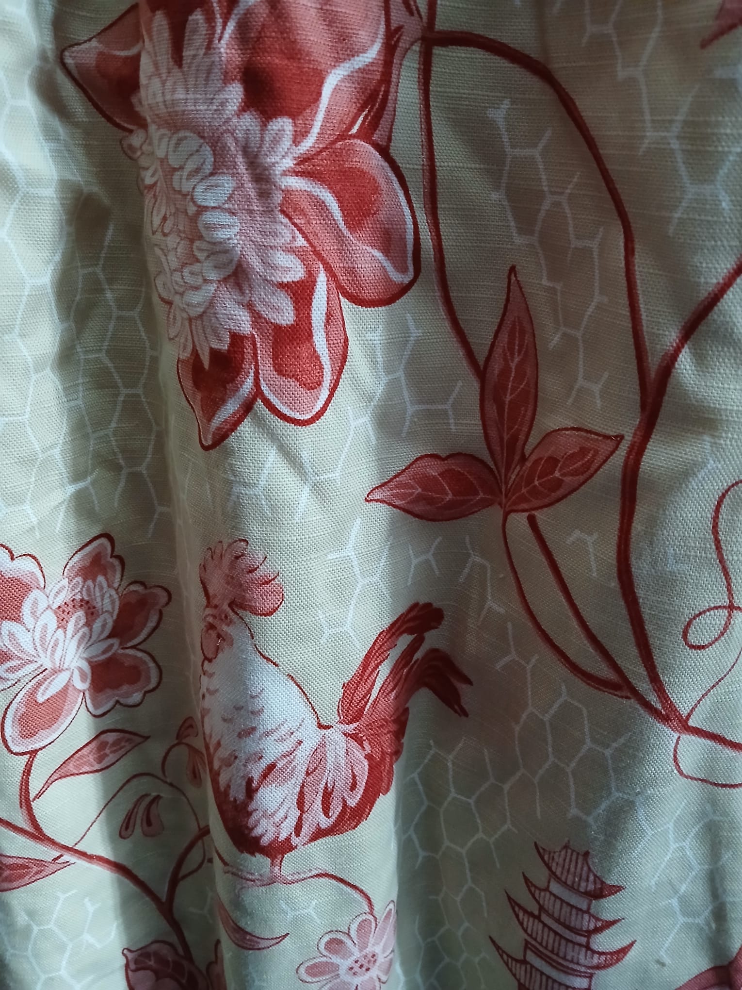 Beige b/g with red oriental rooster,B/O lined & I/L, with pinch pleats, trim on leading edge. This SINGLE curtain will cover 110cm wide by 237cm drop.