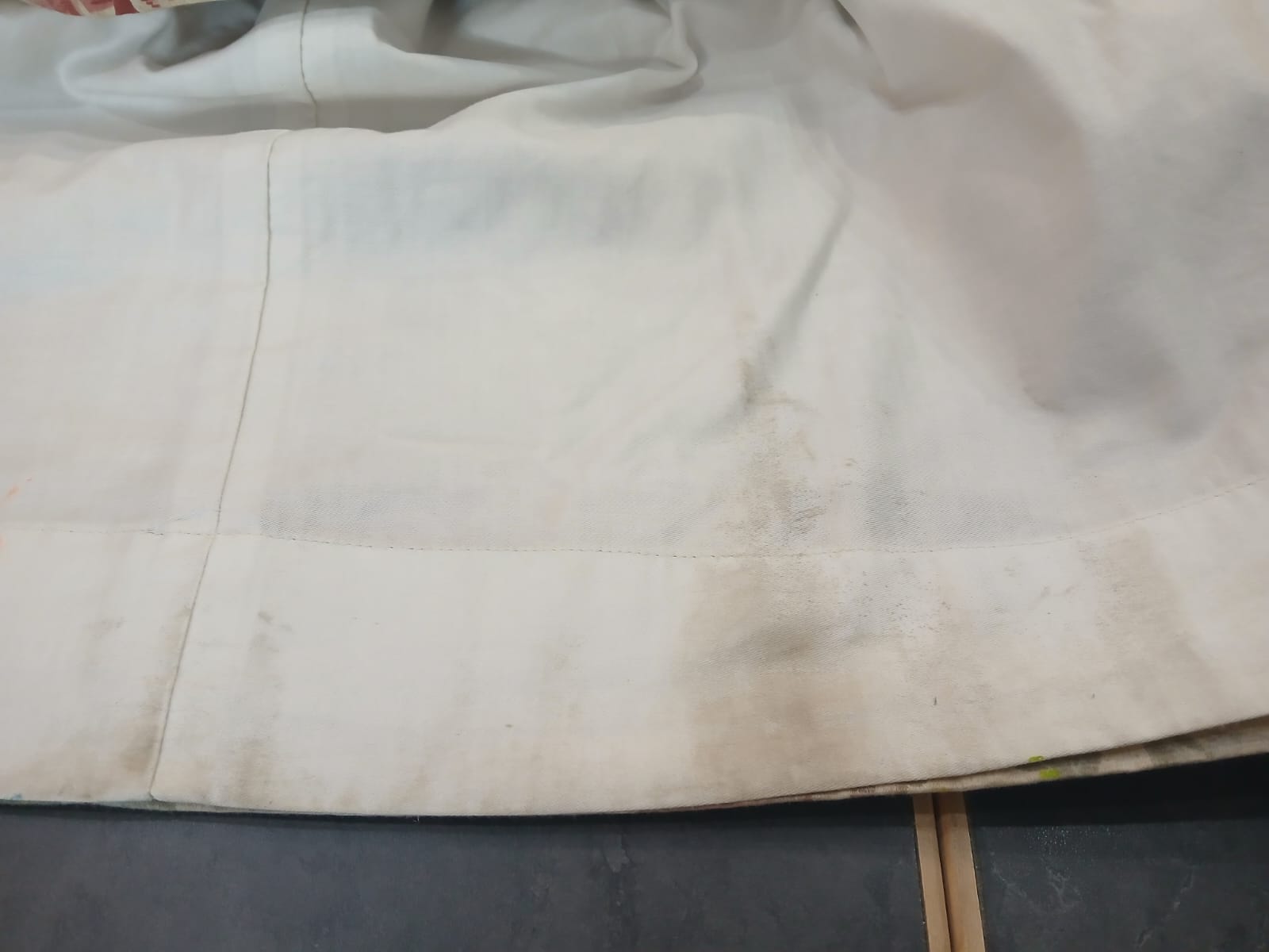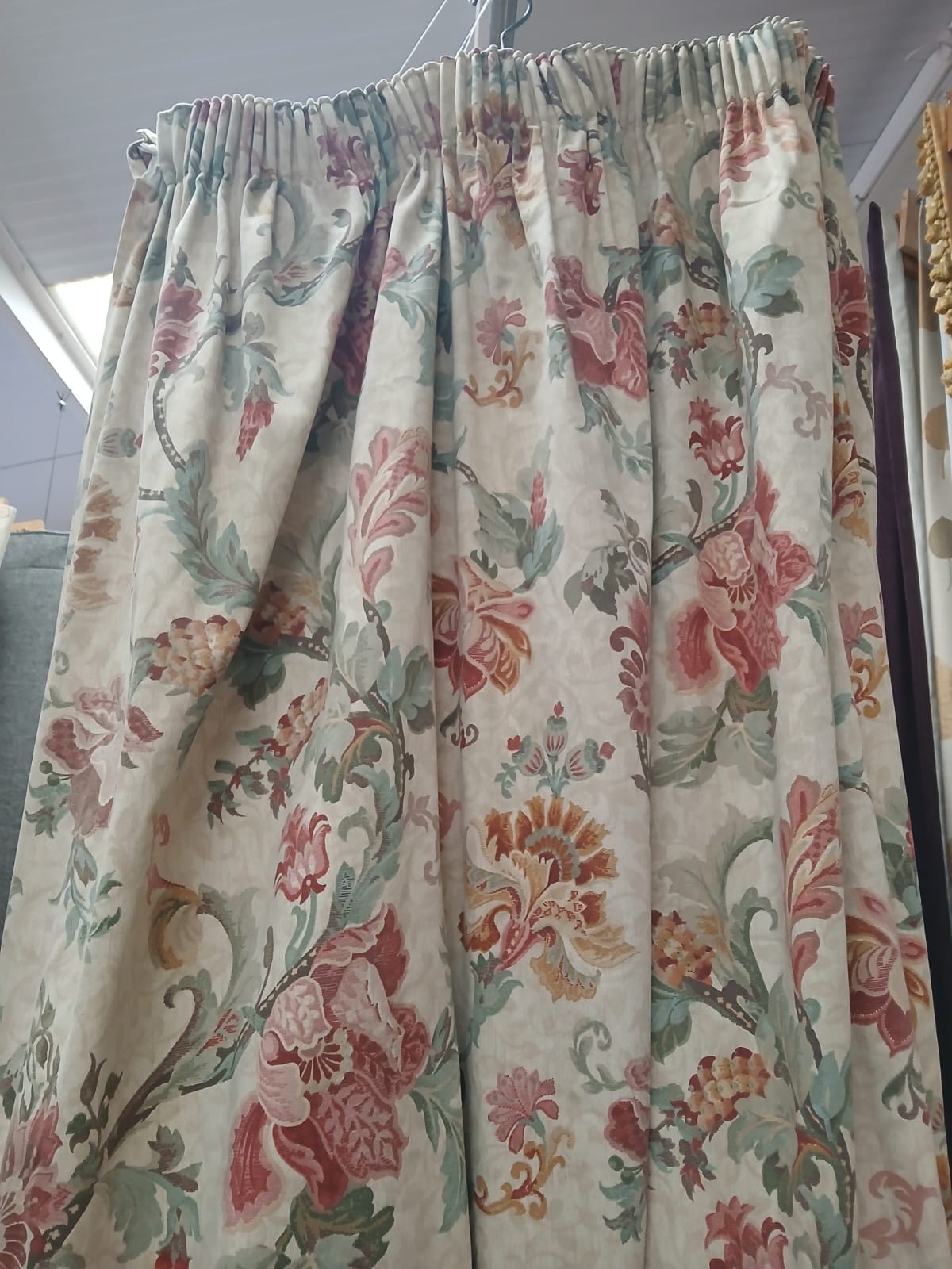 Beige, pink & yellow florals, lined,with pencil pleats. This pair will cover 260cm wide by 200cm drop. Fade to leading edge and marks on linings.
