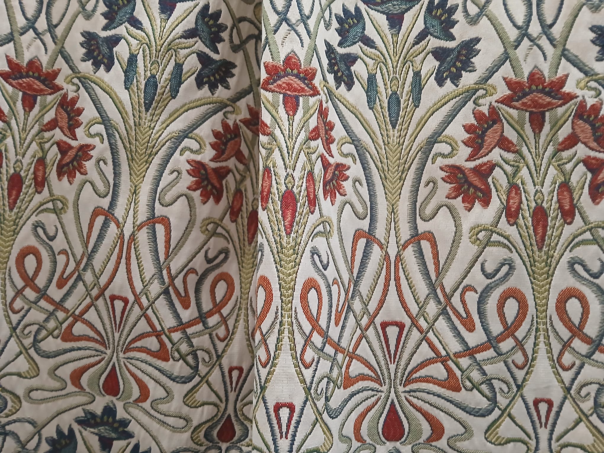 Cream b/g with terracotta and green design, lined, with pencil pleats. This pair will cover 165cm wide by 217cm drop. Tie backs.