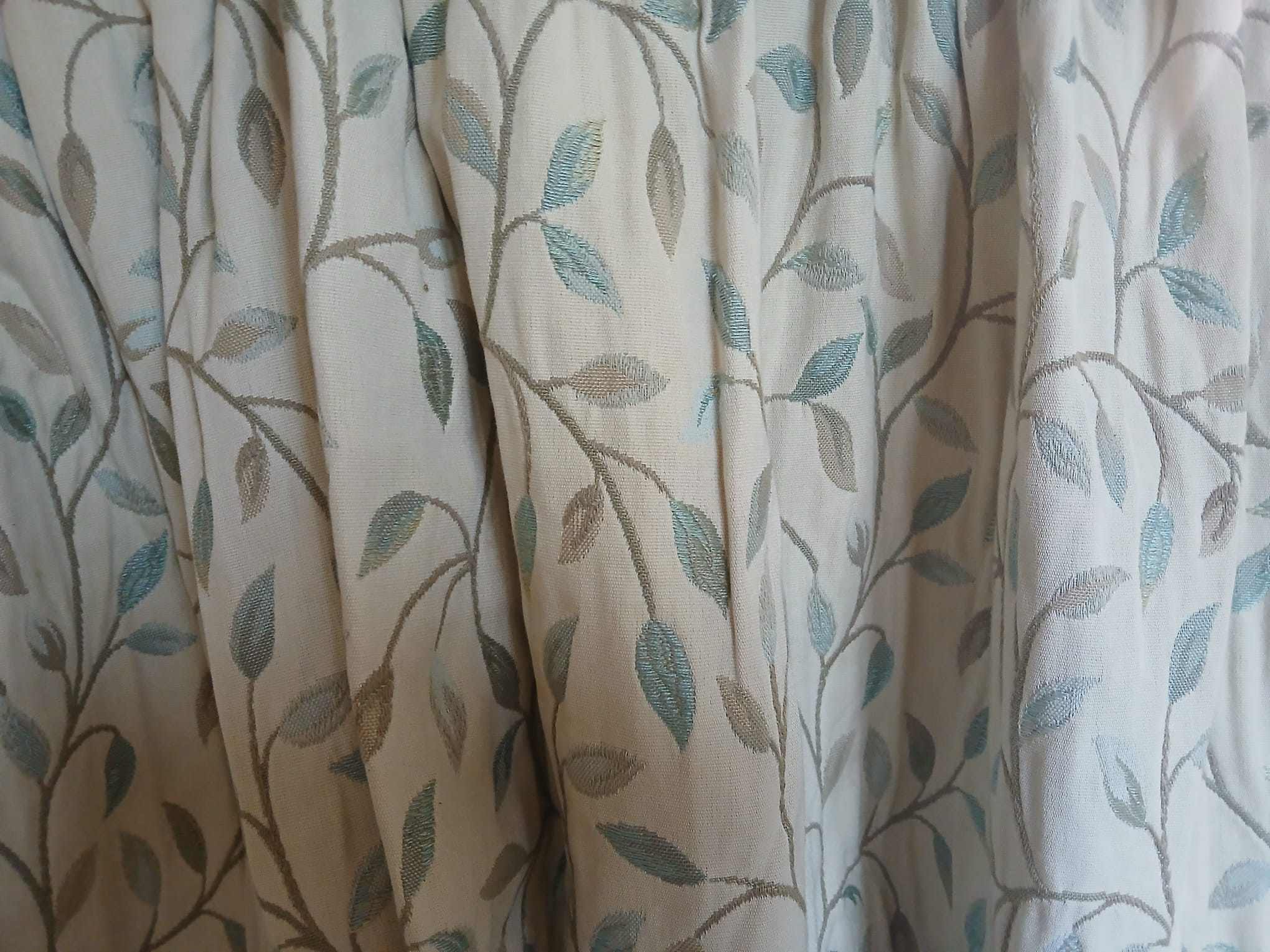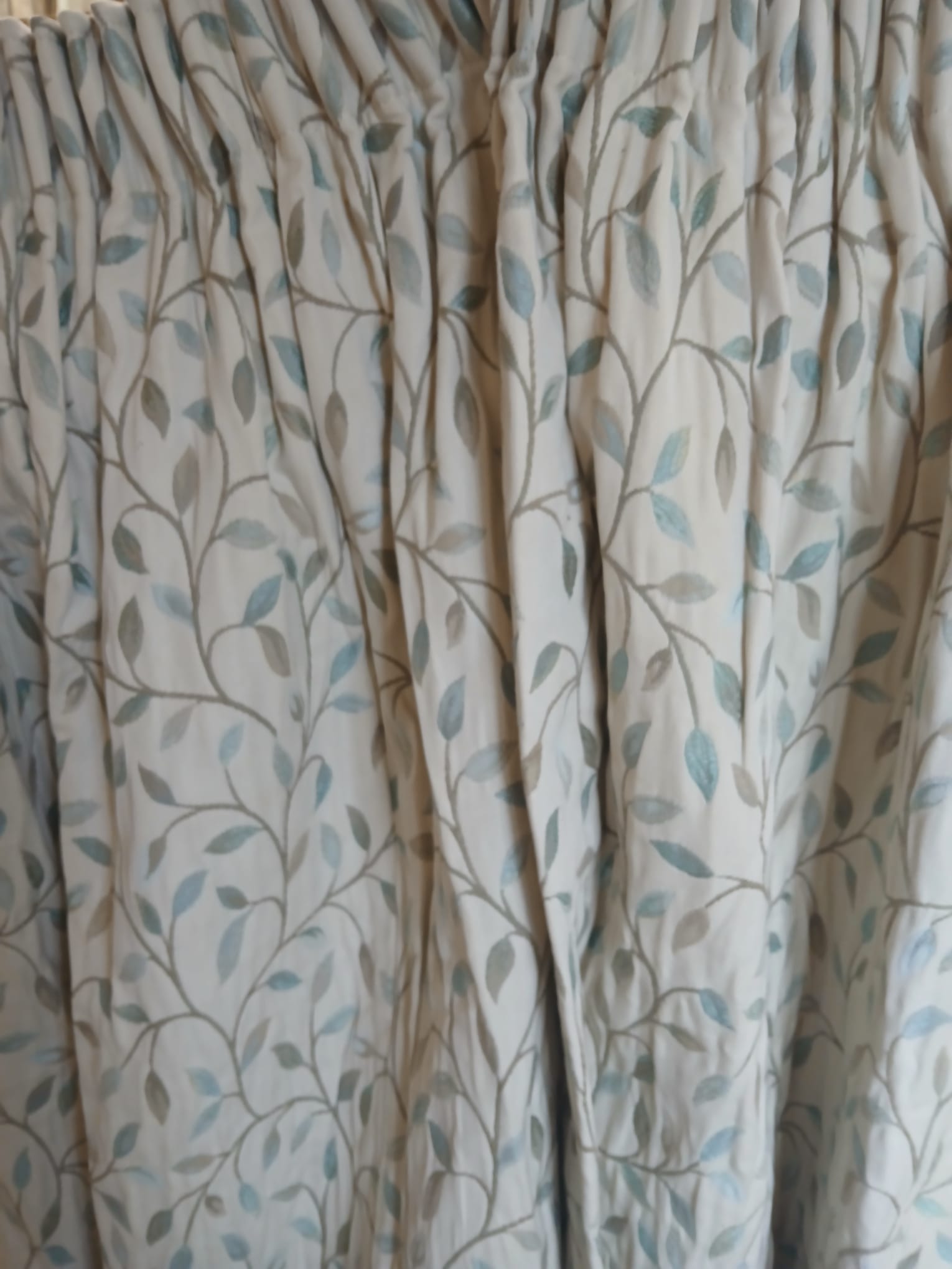 Cream with small teal leaves, lined with pencil pleats. This pair will cover 310cm wide by 106cm drop. Fade to leading edge and some foxing.