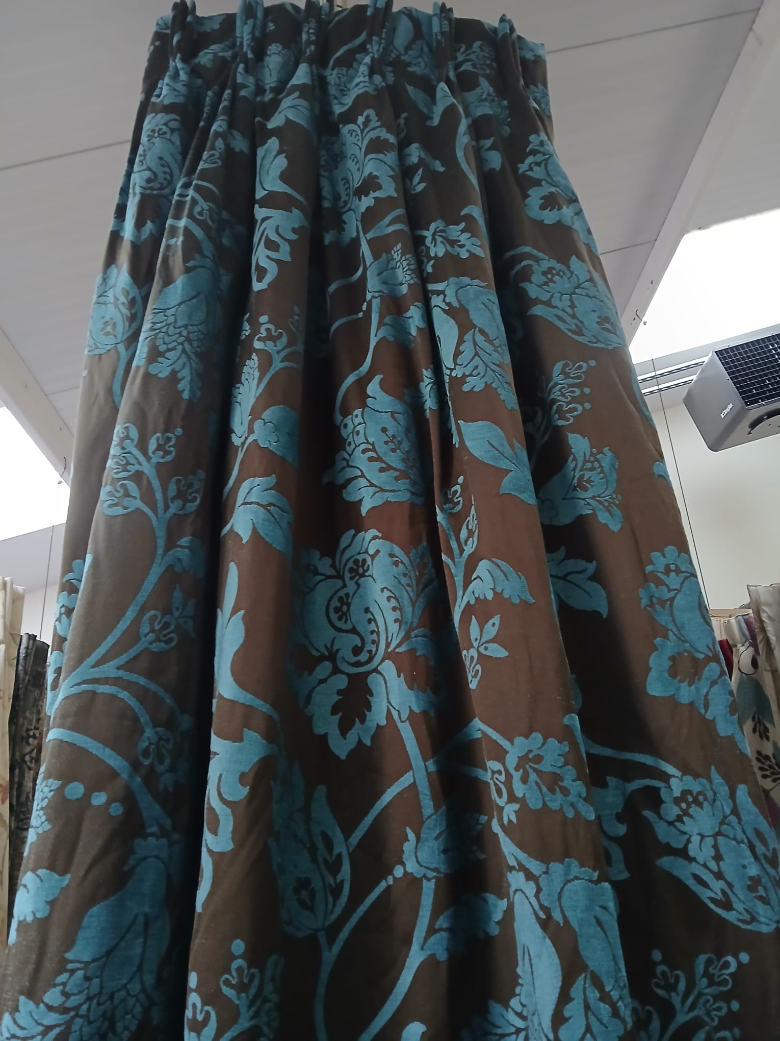 Dark brown & turquoise floral design, lined & I/L with pinch pleats. This pair will cover 270cm wide by 281cm drop.