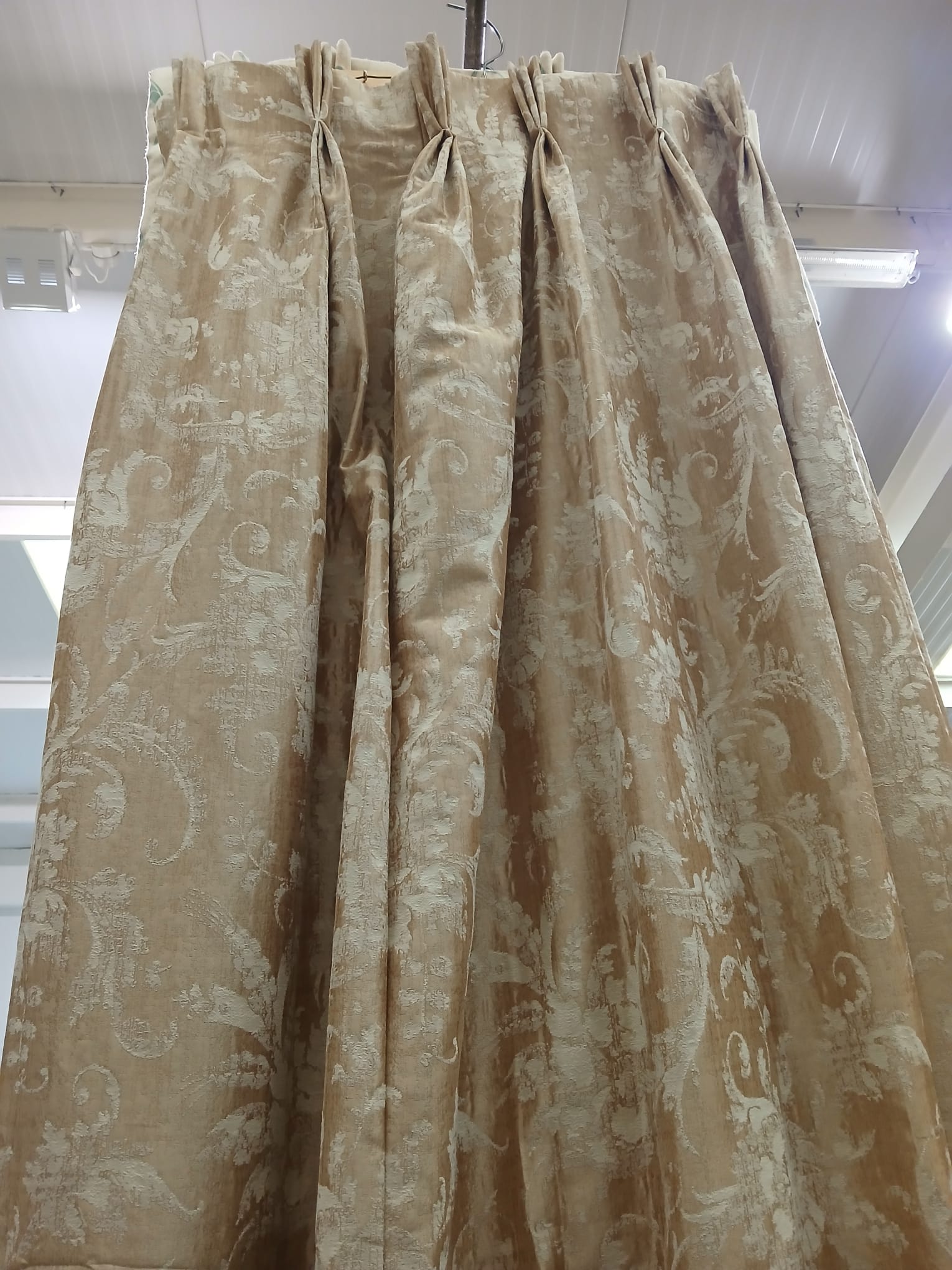 Gold cream design. lined with pinch pleats. This pair will cover 280cm wide by 218cm drop. Fade to linings.