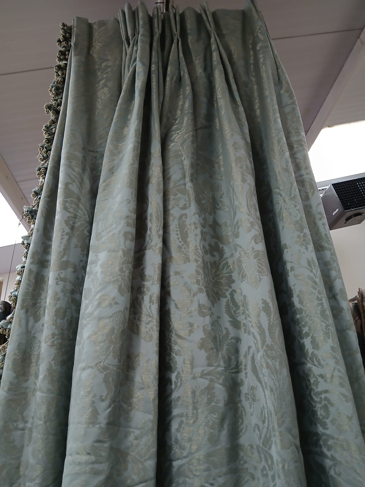 Green damask self pattern, lined & I/L with pinch pleats. This pair will cover 180cm wide by 274cm drop. Tassel braid on leading edge.