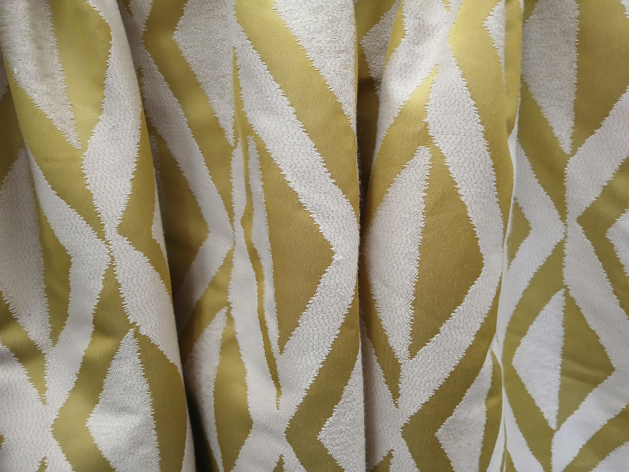 Lime green & beige geometric design, lined & I/L,with pinch pleats. This pair will cover 130cm wide by 147cm drop. Some fade to linings.