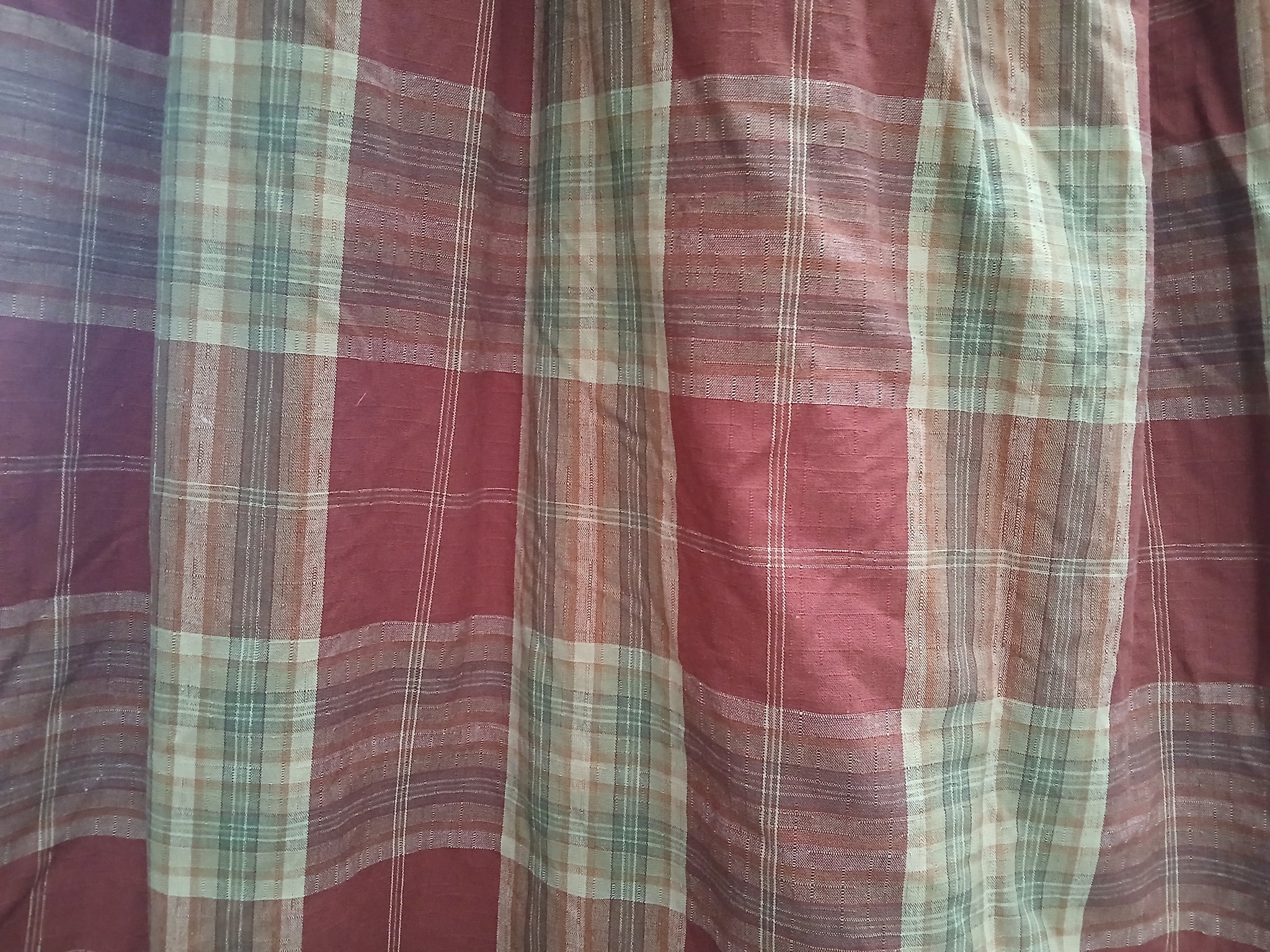 Red, green & beige check, lined & I/L, with ruffle pencil pleats. This pair will cover 250cm wide by 223cm drop. Some small marks on linings.
