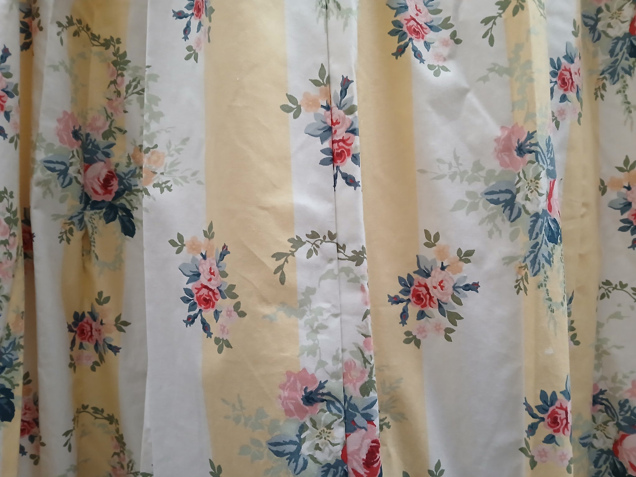 Yellow & white glazed cotton stripe with pink florals, lined & I/L with pencil pleats. This pair will cover 210cm wide by 240cm drop. Some fade to linings. 2 frilled cushions.