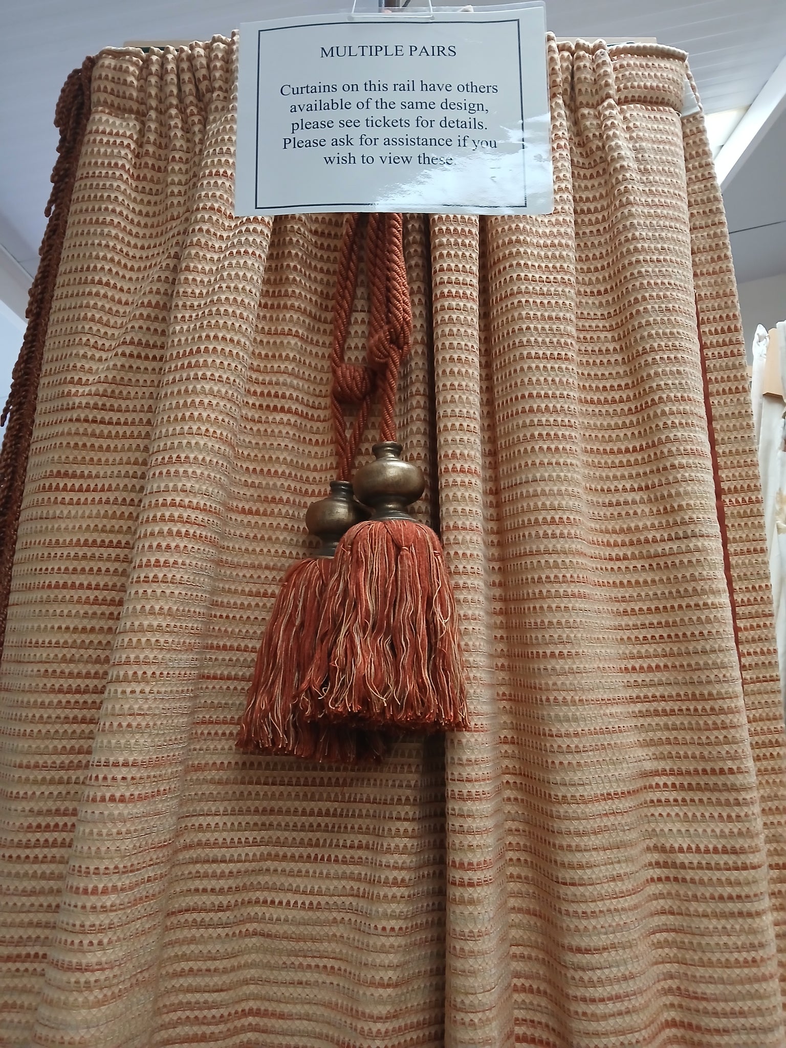 Pale yellow & terracotta design, lined (in terracotta) & I/L, Tassel fringe on leading edge.This pair will cover 260cm wide by 226cm drop. Some fade to lining. Tassel tie backs.