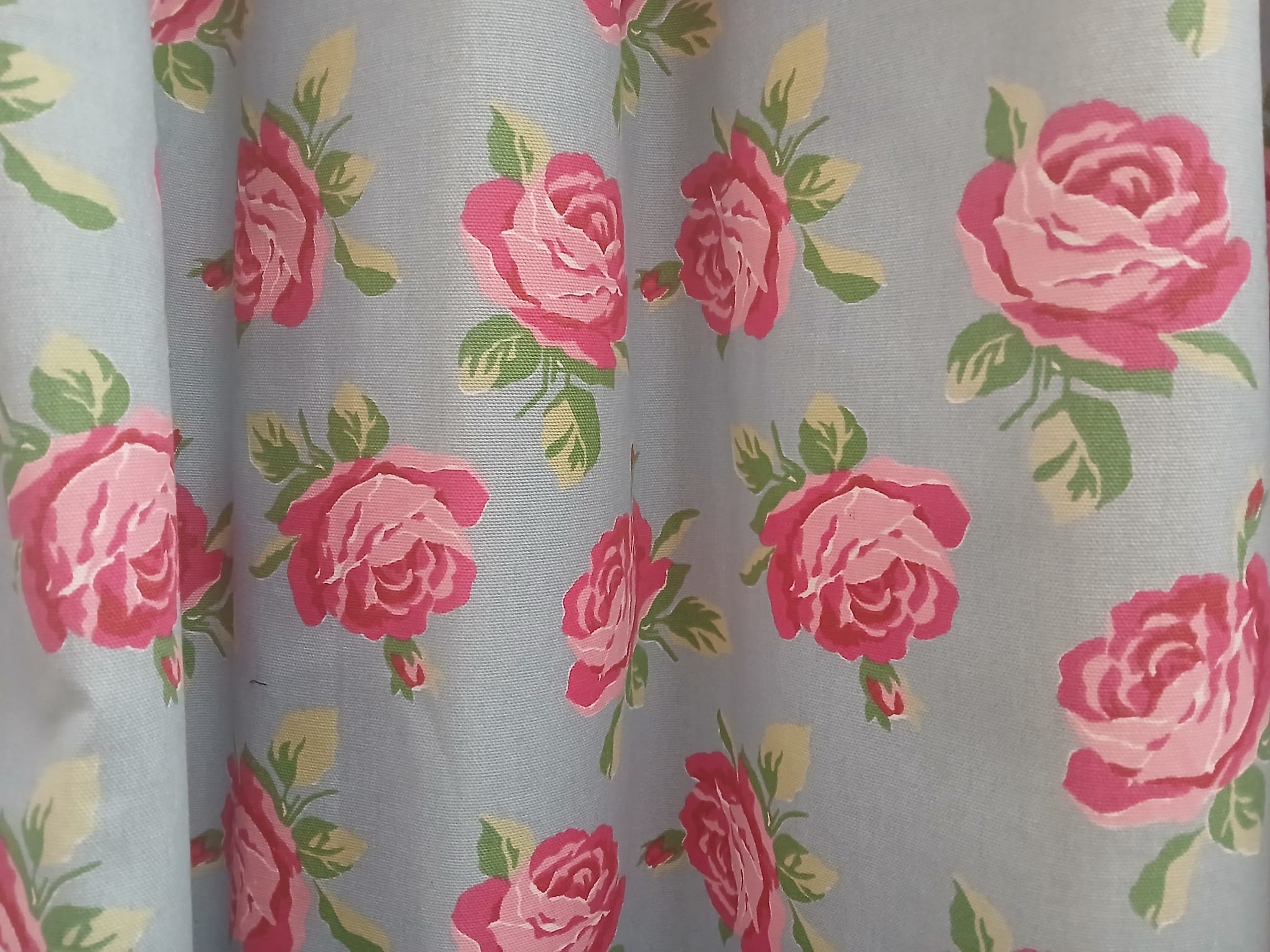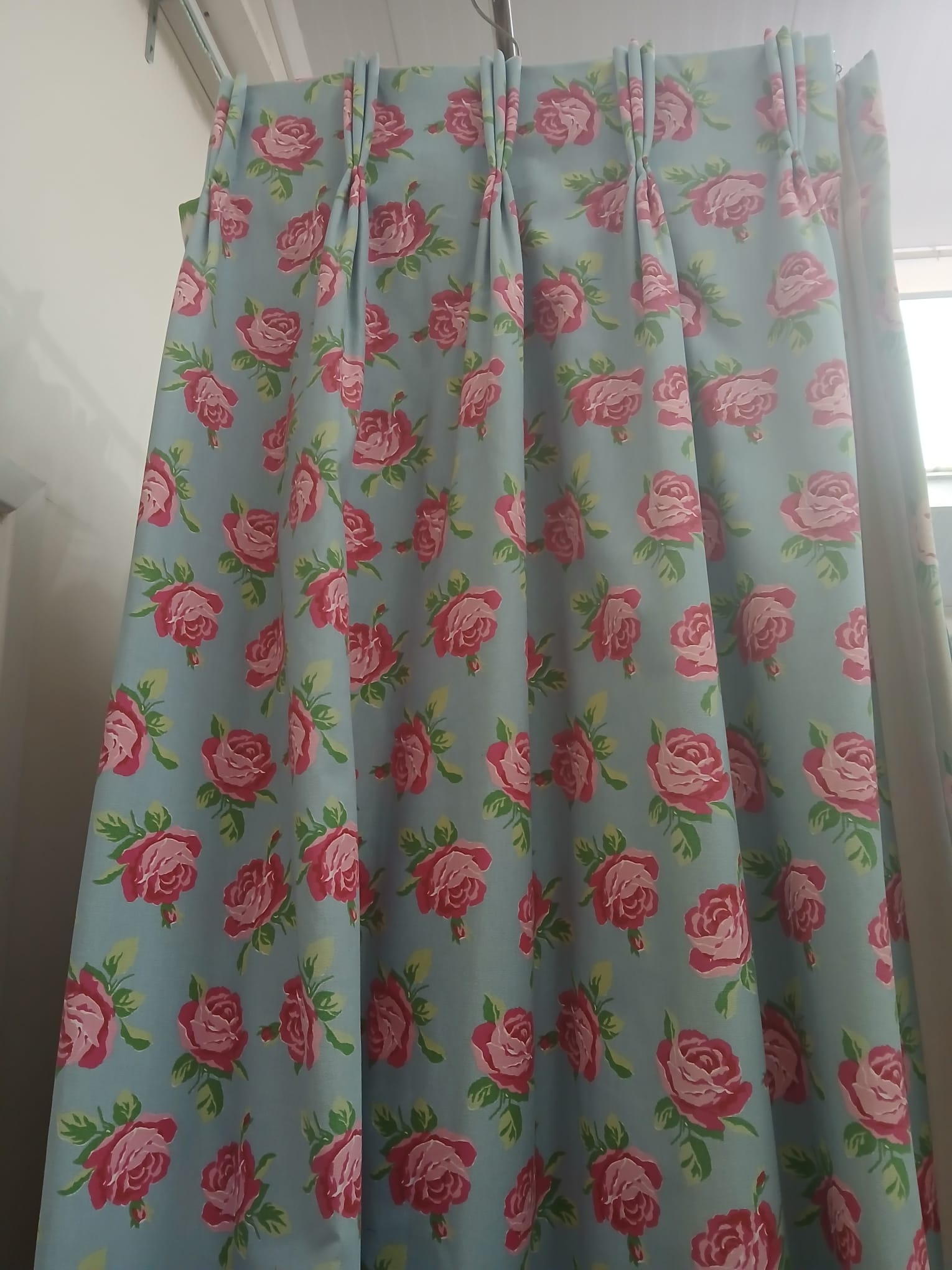 Blue b/g with red roses, lined & I/L with pinch pleats. This pair will cover 230cm wide by 197cm drop. Some fade to leading edge.