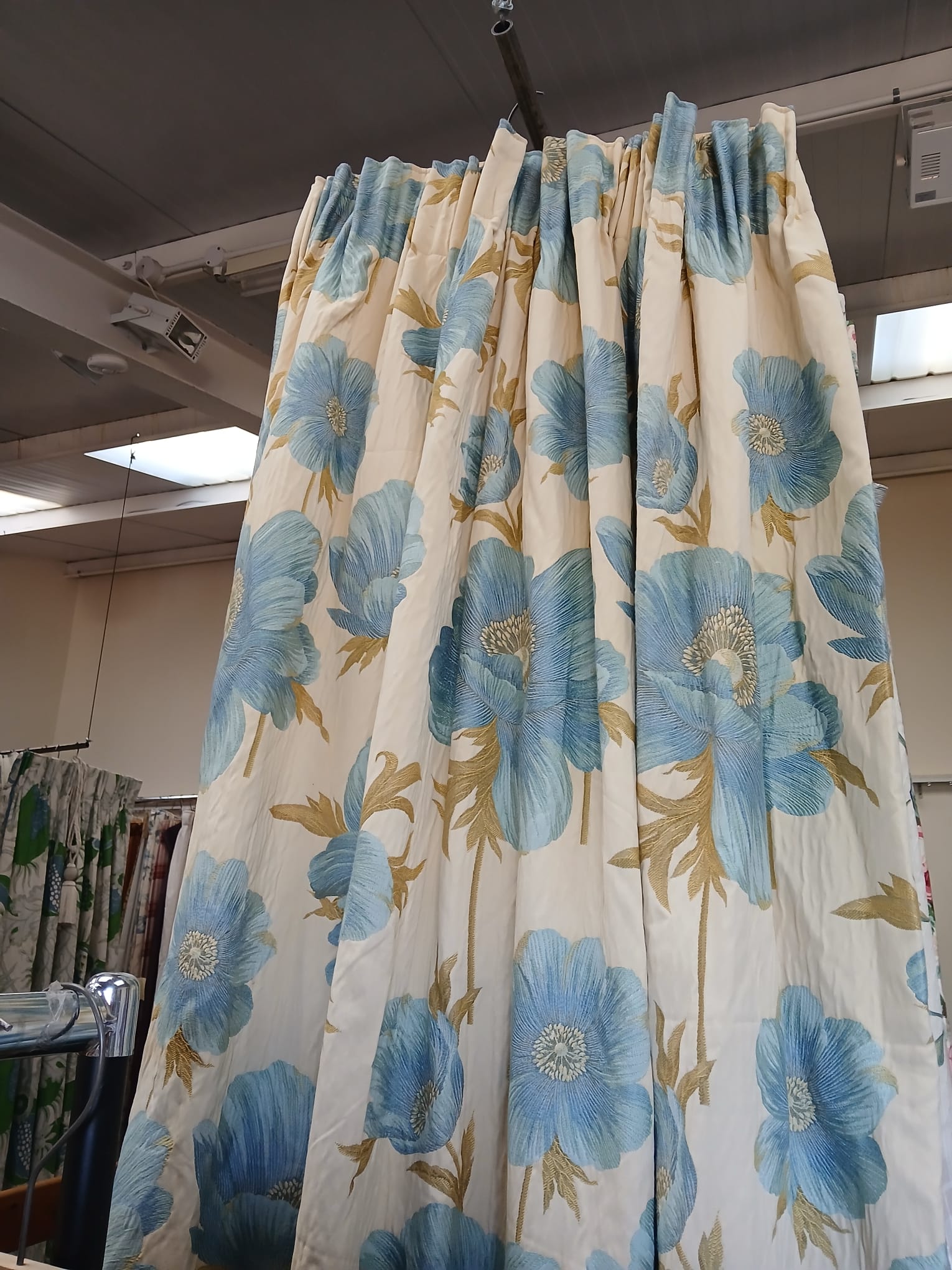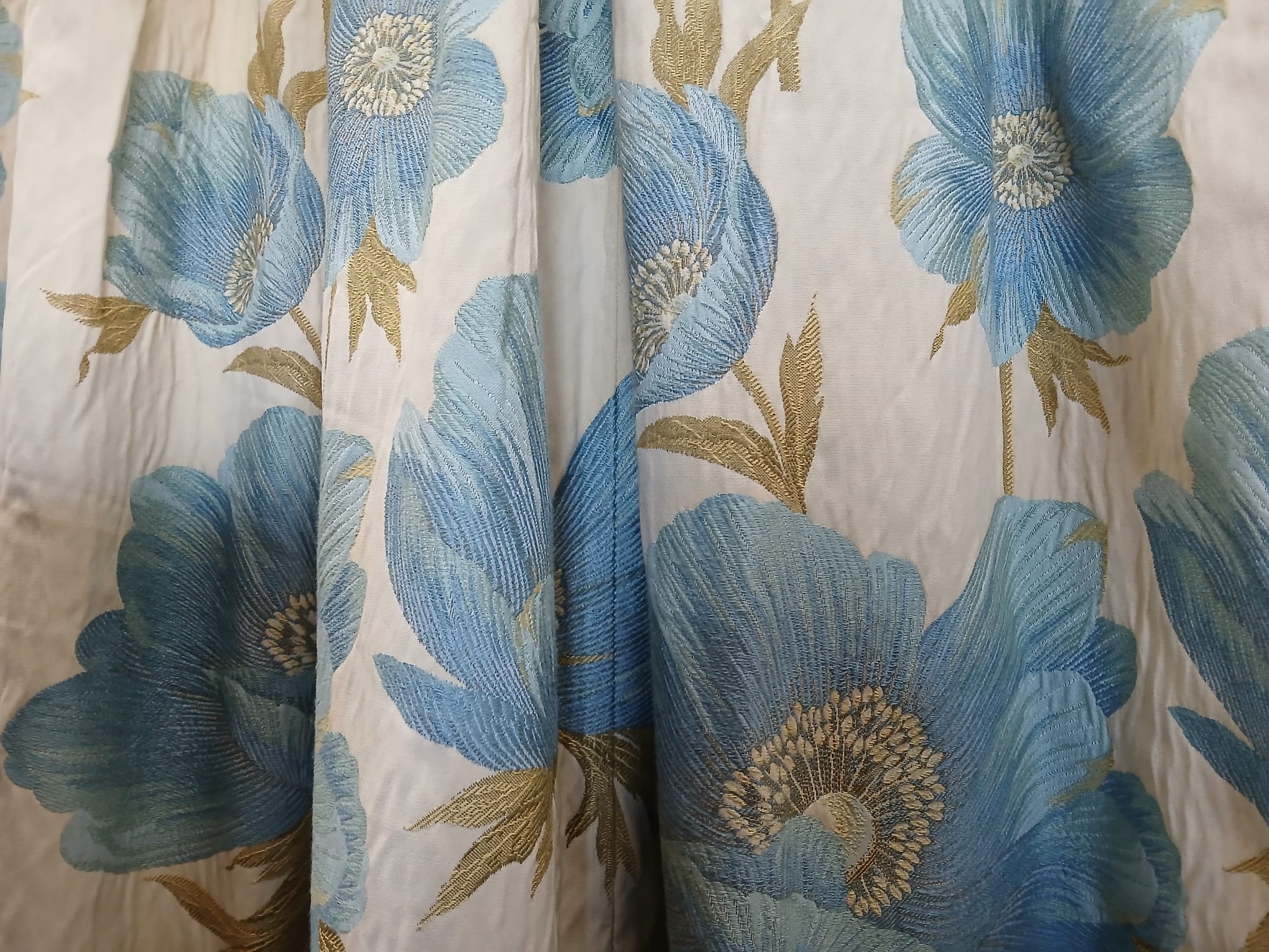 Cream with large blue florals, lined with pencil pleats. This pair will cover 204cm wide by 195cm drop.