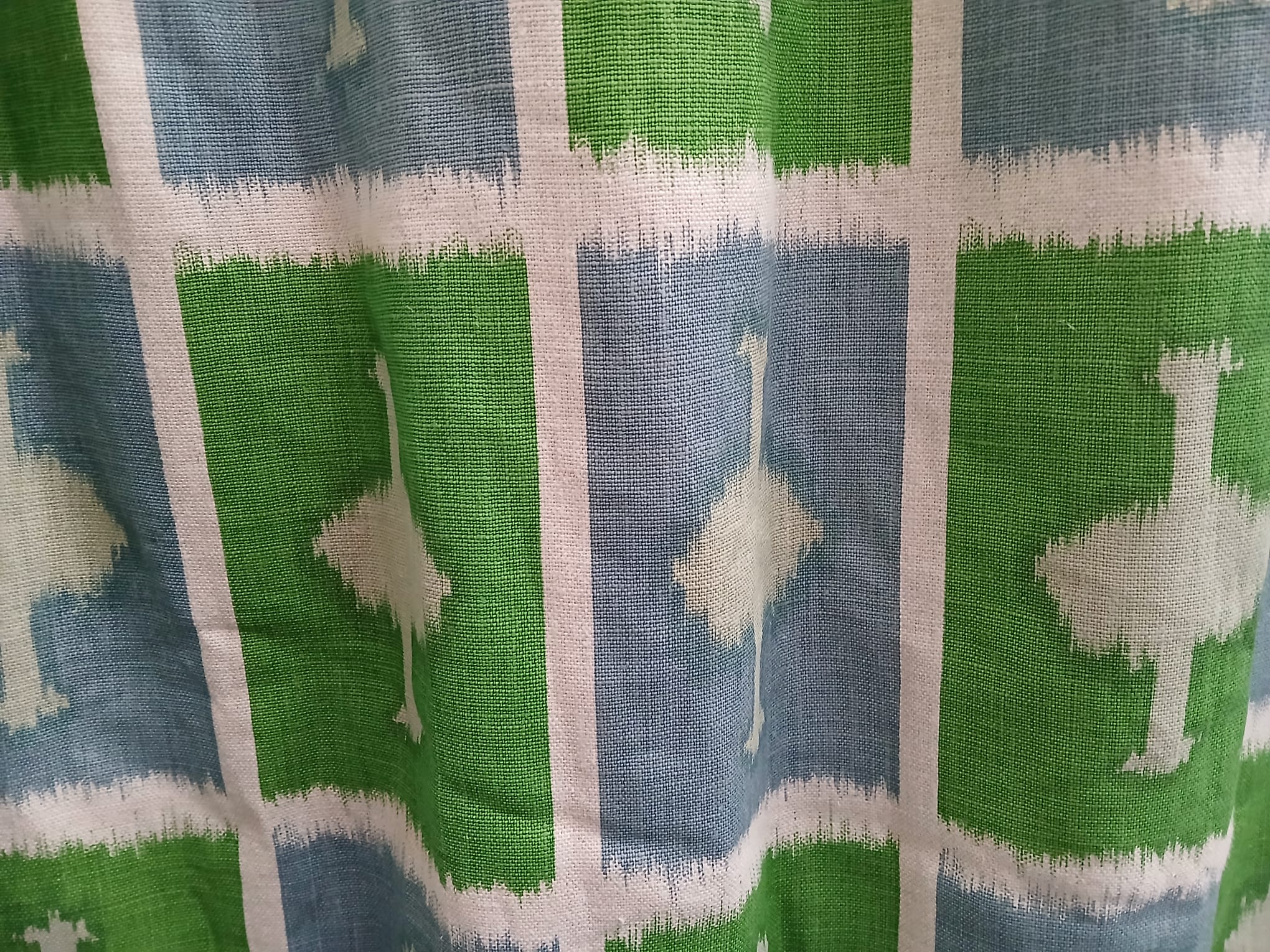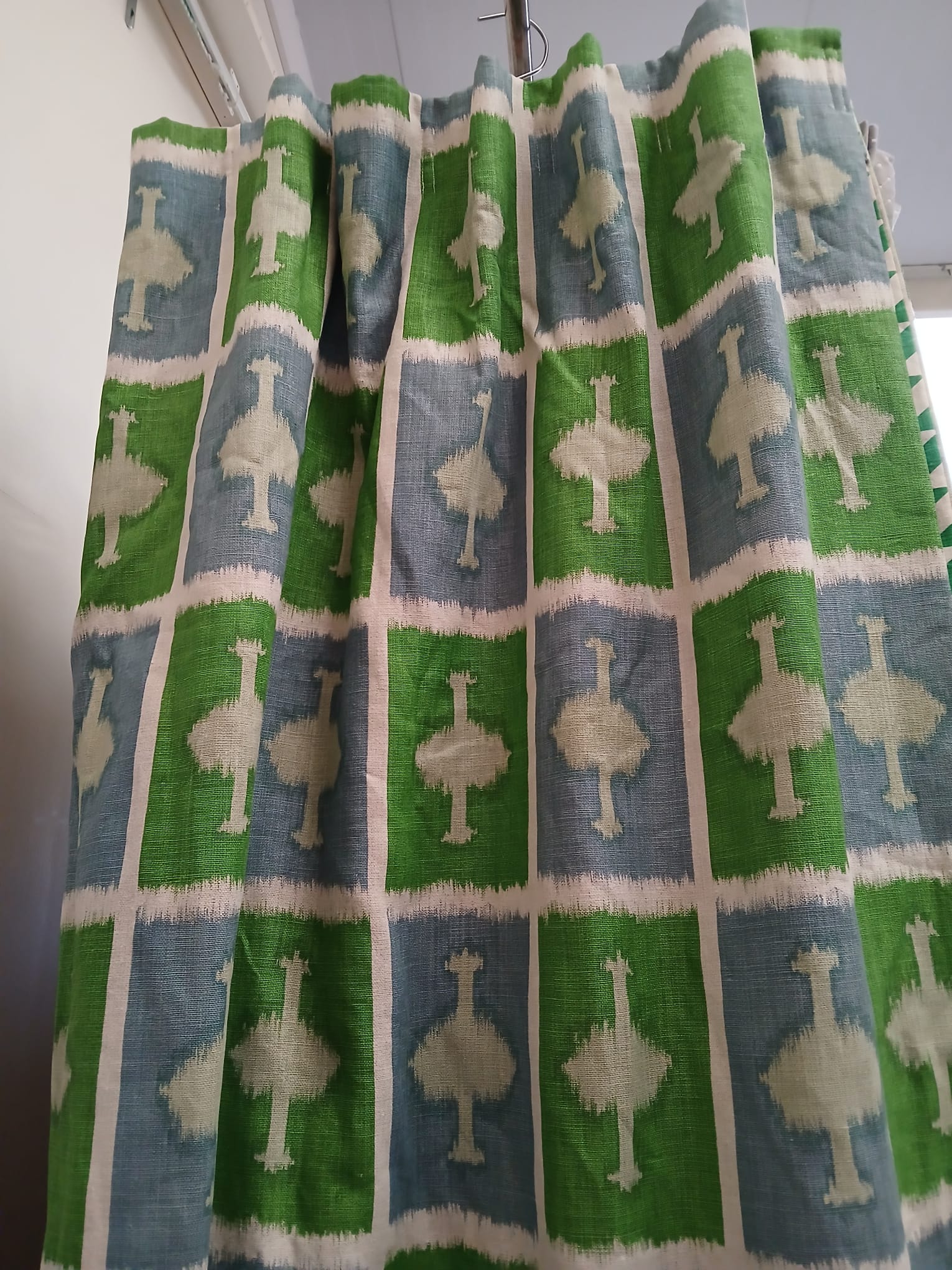 Lime green and blue square design, lined in green geometric, with wave /pinch heading. This pair will cover 350cm wide by 242cm drop.