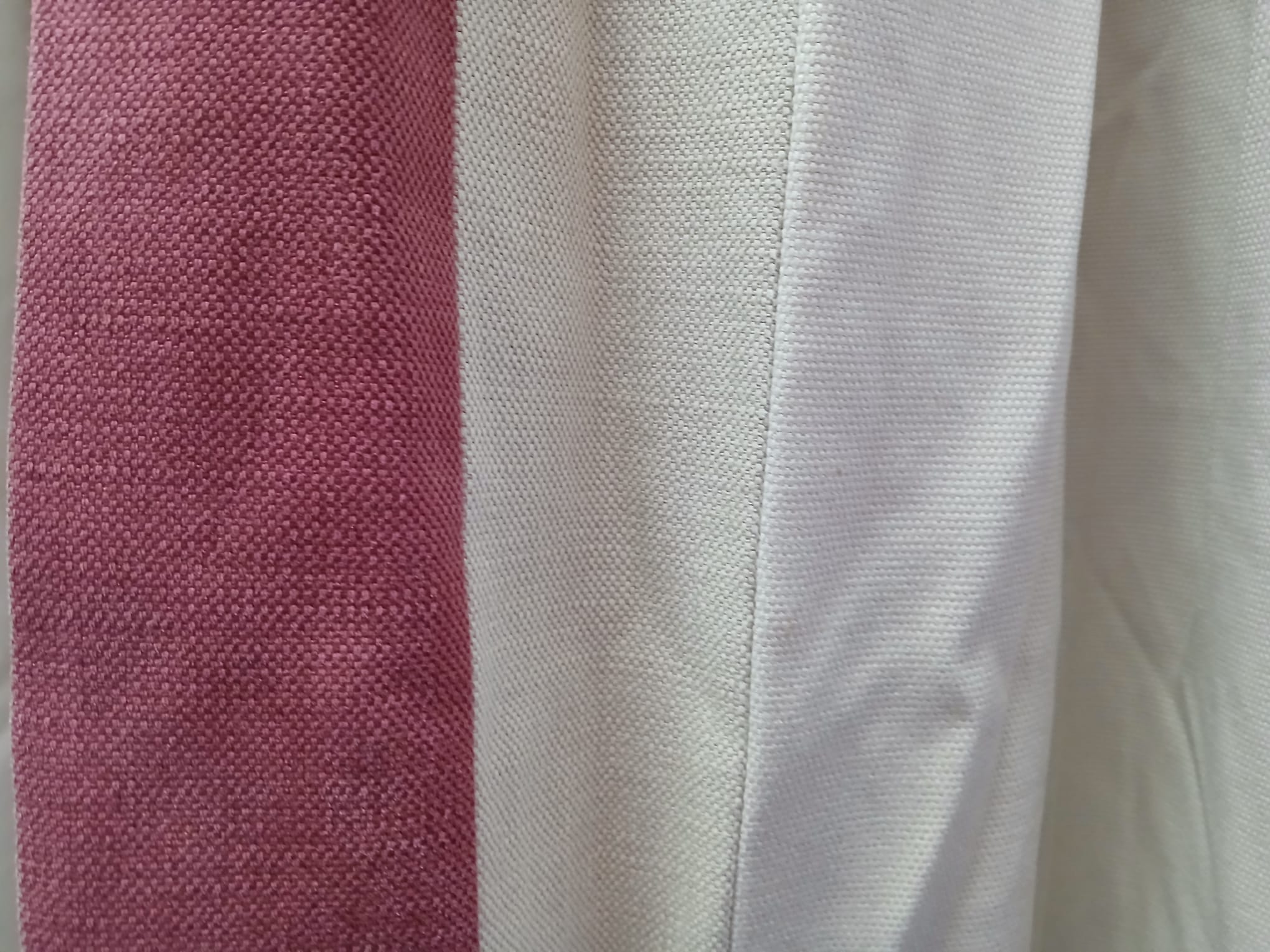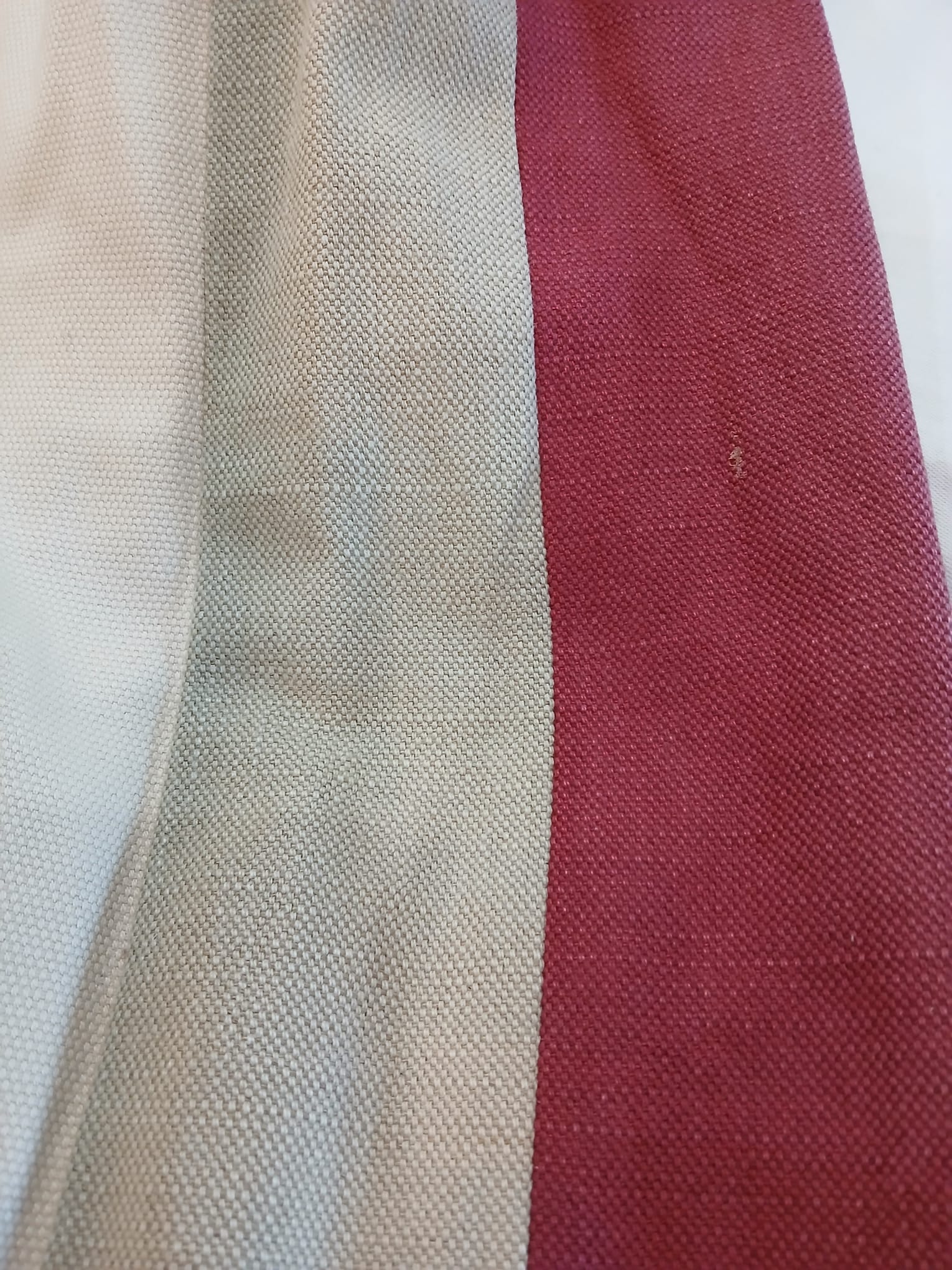 Plain beige with red/darker beige leading edge, (each border approx 7cm, main body of curtain is cream) lined, with pinch pleats. This pair will cover 660cm wide by 250cm drop. Some fade to leading edge, and discoluration on beige stripe towards the top of curtains, see photo.