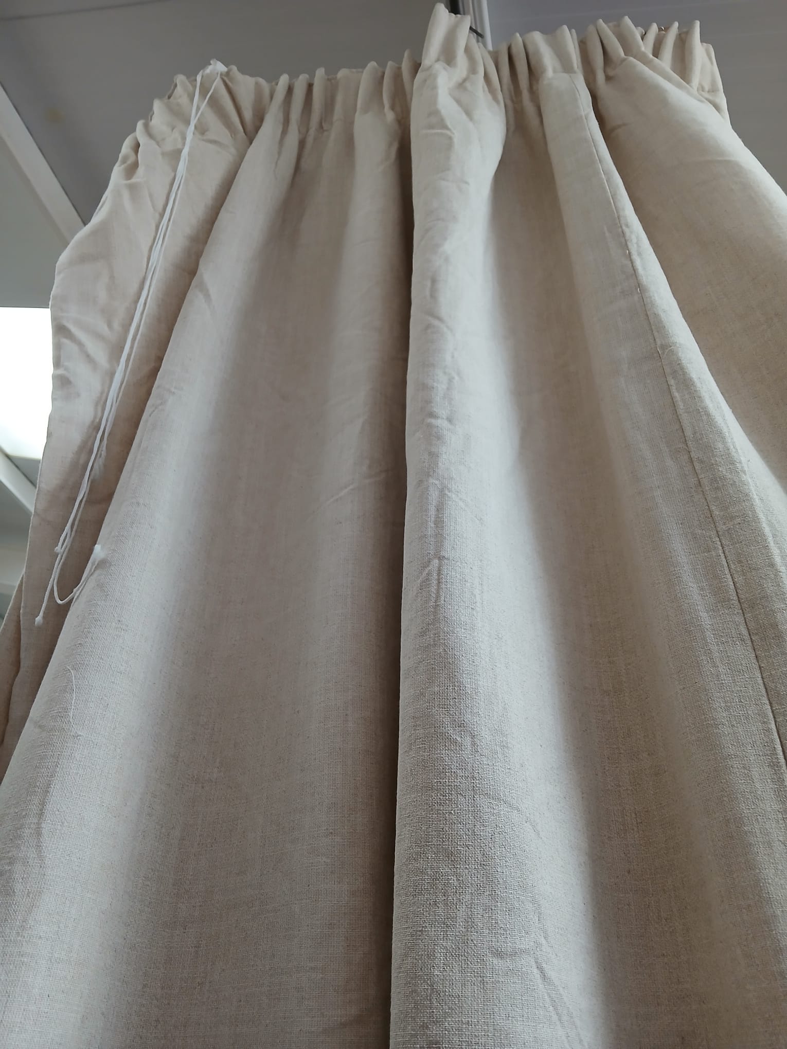 Plain cream Linen blend, lined & I/L with 6" pencil pleats. This pair will cover 330cm wide by 260cm drop. Some slight fade in folds.